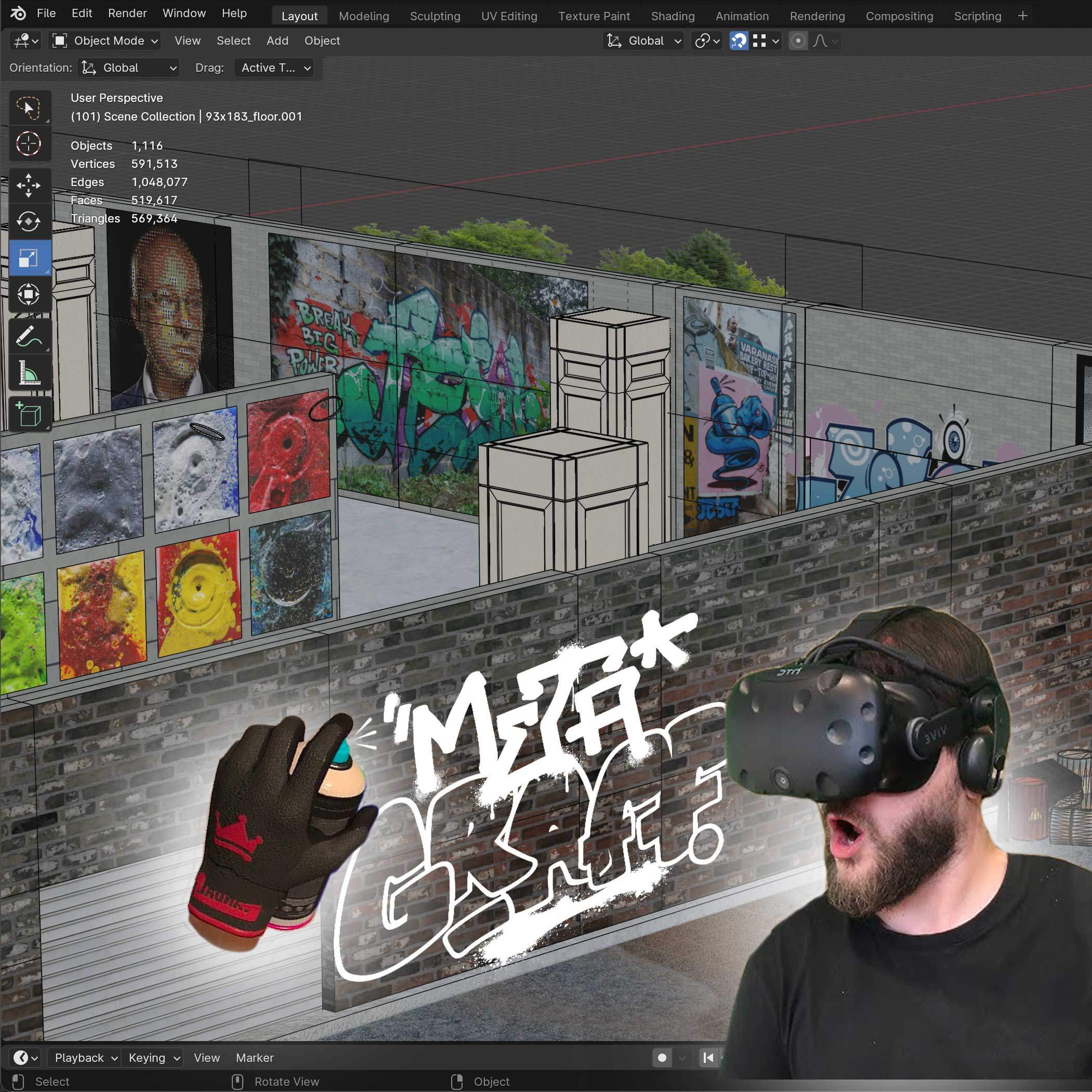 “It’s a live graffiti metaverse gallery that allows artists to create & collaborate on artworks, live-stream their vr paint sessions, records the process and outcomes as a downloadable documentation pack, and offers them a platform inside the same virtual space to showcase and sell their work. All hosted on the internet and facilitated on the Solana blockchain.”